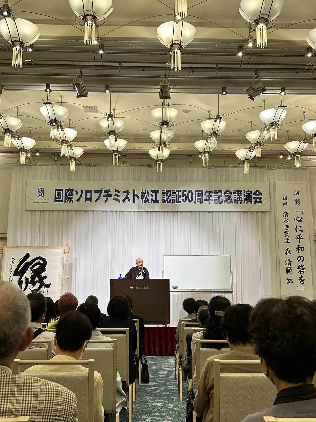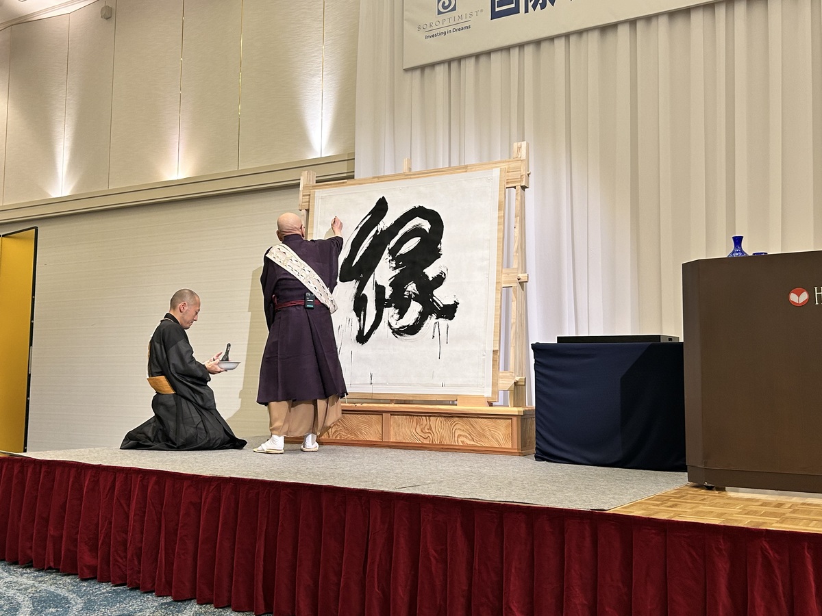 2026年02月02日 令和7年10月11日(土)ホテル一畑 2階平安の間にて、認証50周年記念事業の一環として、 「今年の漢字」を巨大な和紙に一字を揮毫される 「清水寺 貫主 森 清範 師」をお招きし、記念講演会を開催致しました。 ご講演と共に、壇上で大きな紙に「縁」を揮毫いただき、会場を盛り上げて下さいました。
